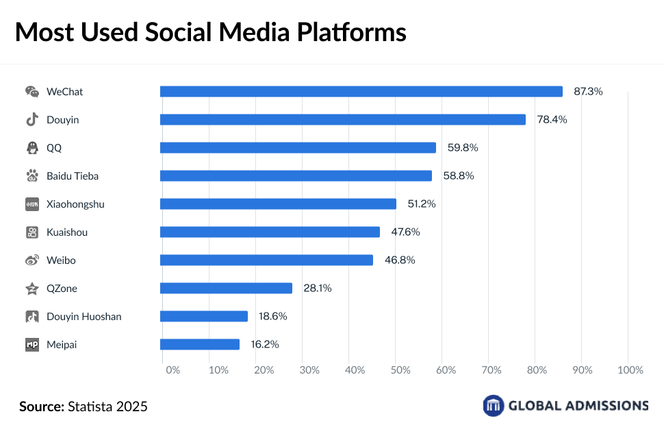 In the digital age, social media and search engines are the primary research tools for both students and parents. Given China’s unique internet ecosystem, platforms like WeChat (87.3%), Douyin (78.4%), and Xiaohongshu (51.2%) are widely used for gathering information and engaging with universities. Xiaohongshu, in particular, has become a key platform for students to seek peer advice, read alumni experiences, and explore study options. Since Google is restricted in China, students rely less on traditional search engines like Xiaohongshu and more on social platforms for authentic, user-generated content when researching study abroad opportunities.