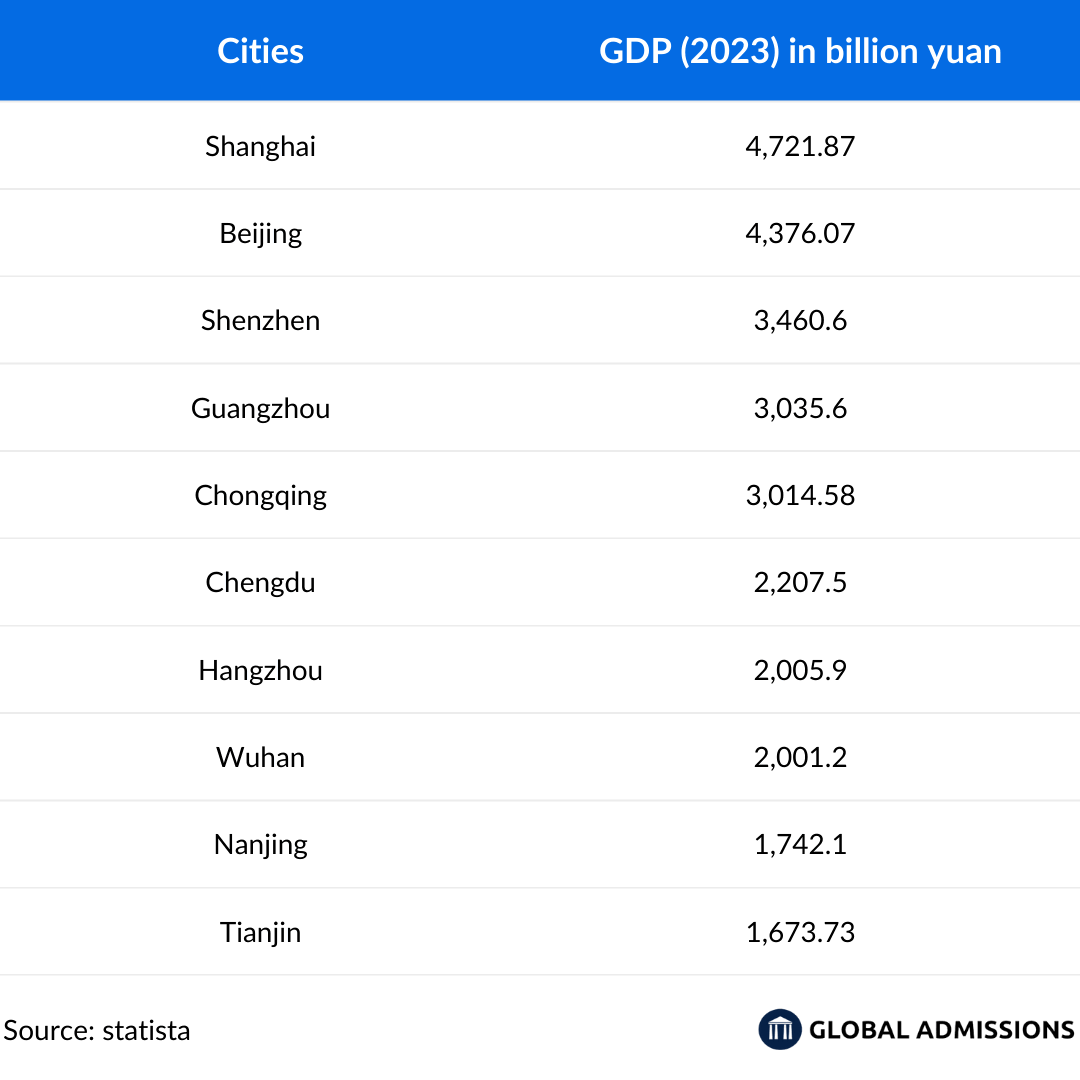 China’s rapid economic growth has positioned it as a global powerhouse, with key metropolitan cities driving innovation and development. Major hubs like Shanghai, Beijing, Shenzhen, and Guangzhou lead the country’s economy, with Shanghai boasting the highest GDP at 4,721.87 billion yuan in 2023. These cities serve as financial, technological, and educational centers, attracting international students seeking high-quality education and career opportunities.