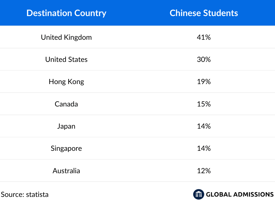 China remains one of the largest sources of international students worldwide, with an increasing number seeking education abroad for better career prospects, quality education, and global exposure. The United Kingdom (41%) is the top destination, followed by the United States (30%), Hong Kong (19%), Canada (15%), Japan (14%), Singapore (14%), and Australia (12%). Other destinations, including Germany (10%), France (6%), and New Zealand (5%), are also attracting Chinese students, particularly for specialized programs and lower tuition costs.