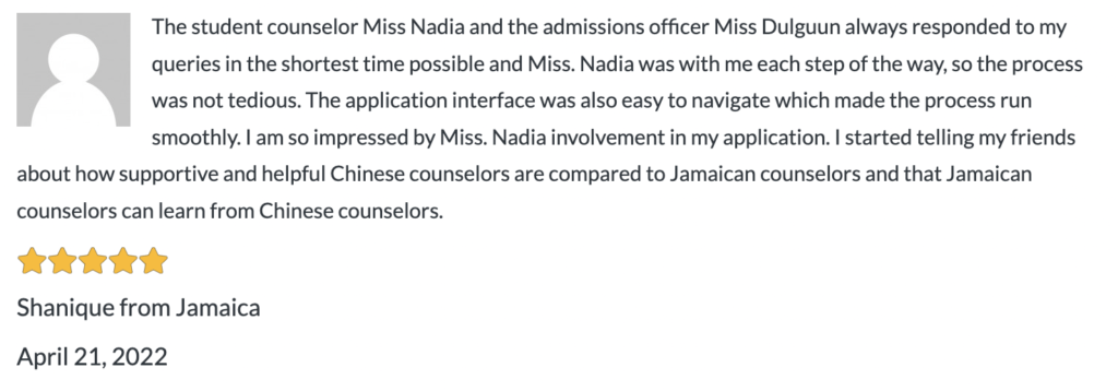 Read more students' testimonials of China Admissions here.