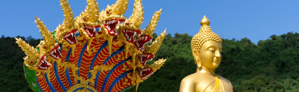 The Legend of Naga is a prominent myth in Thailand and other Southeast Asian countries. Naga is a serpent-like mythical creature believed to inhabit water bodies, especially rivers and lakes. In Thai folklore, the Naga is often depicted as a benevolent and protective being associated with water and fertility. Statues and images of Naga are common at temples and water-related sites across Thailand.
