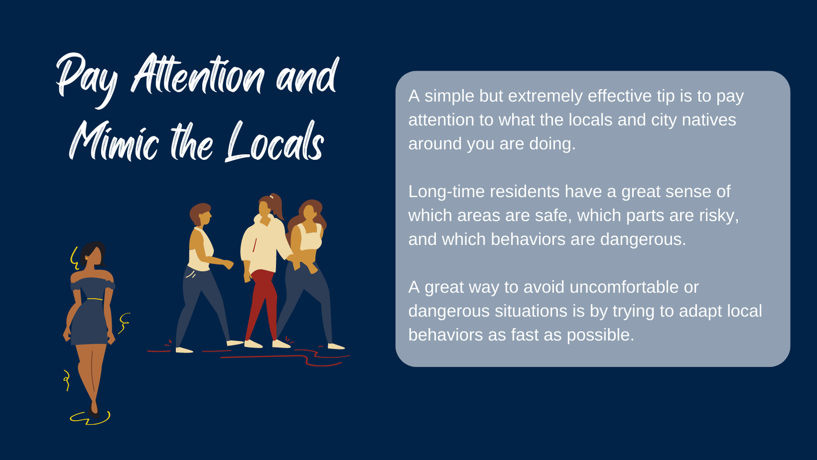 This safety tip also works well for smaller situations--pay attention to how people cross the street, how cars stop (or don't stop!) for pedestrians, whether locals are eating the street food or not, etc. A great way to avoid uncomfortable or dangerous situations is by trying to adapt local behaviors as fast as possible.