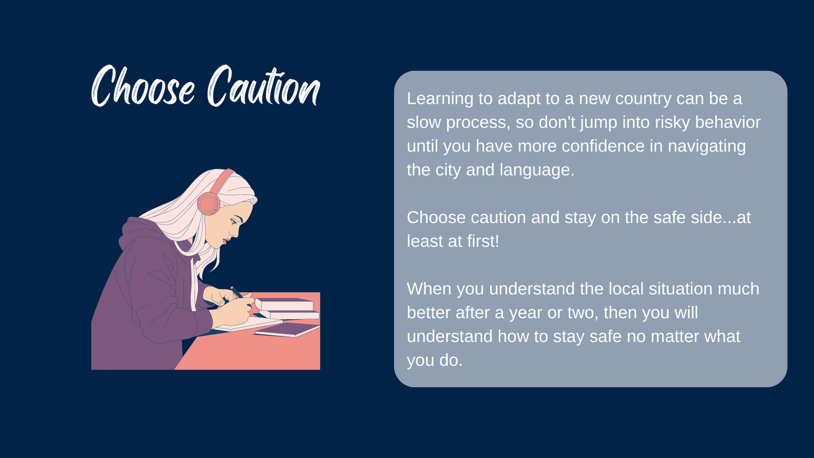 Choose caution and stay on the safe side...at least at first! When you understand the local situation much better after a year or two, then you will understand how to stay safe no matter what you do. Staying out late or exploring a little-known part of town will be much safer for you once you understand how to talk, act, and walk like a local.