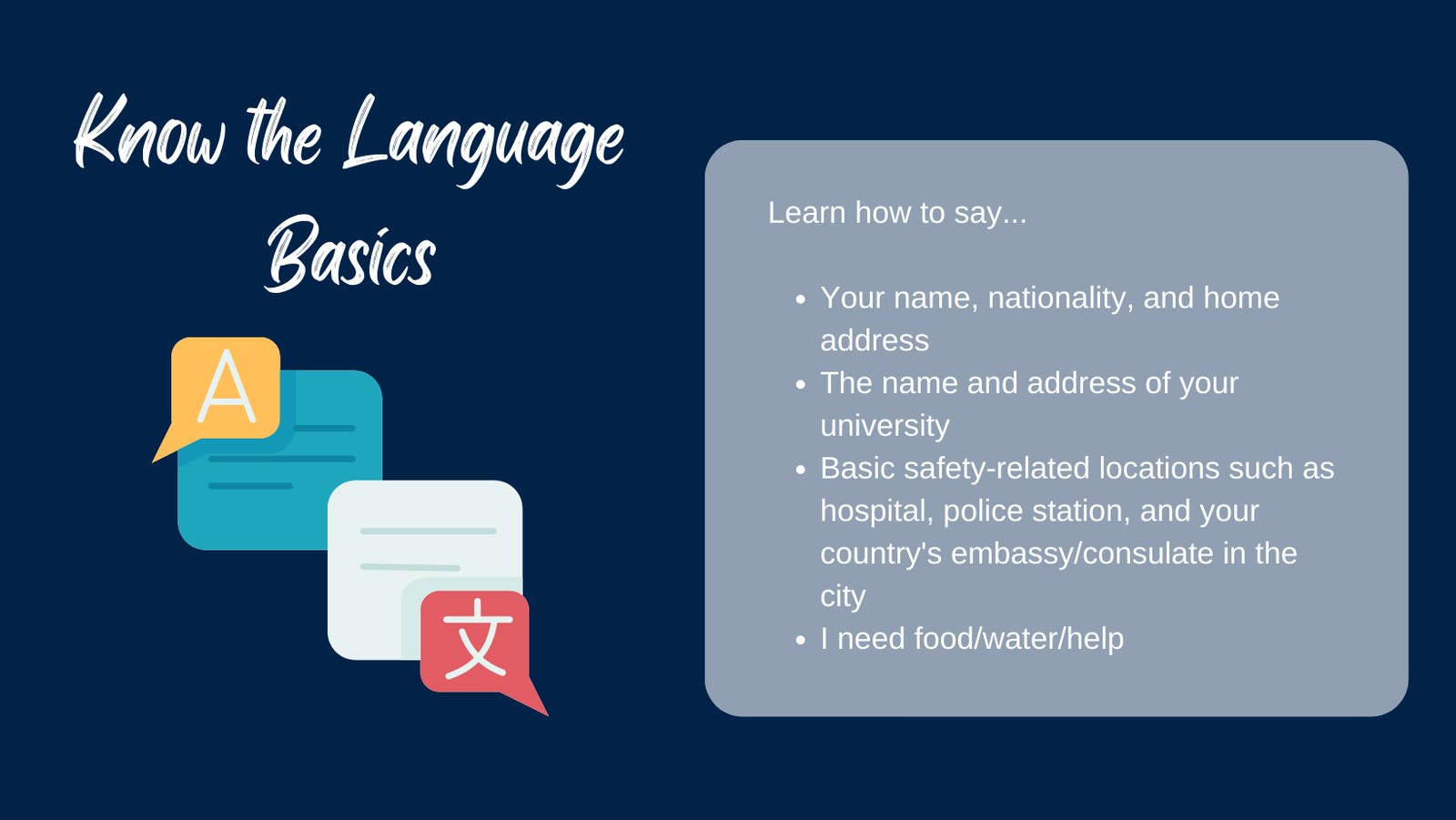 It goes without saying that in order to stay safe abroad, you need to be able to communicate some basic needs. Whether you are studying in a French, English, or Chinese-speaking country, you should be able to navigate some basic safety information in an emergency.