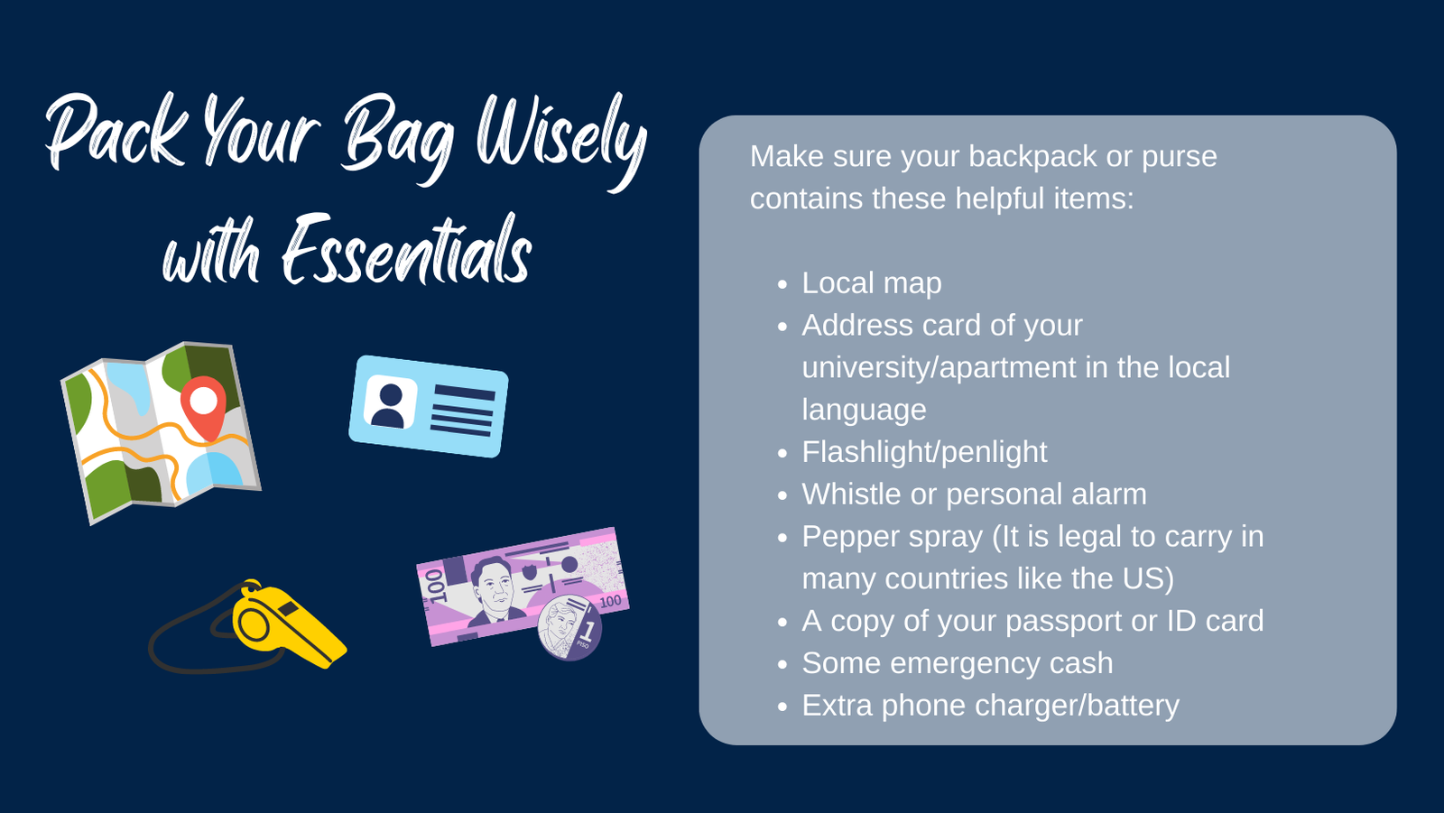 If you are lost in an unfamiliar area, find yourself walking alone at night, or need to show your ID/student status, these items will come in handy. A local map/printed address of your university is especially necessary if you do not yet speak the local language fluently enough to ask for directions or follow street signs.