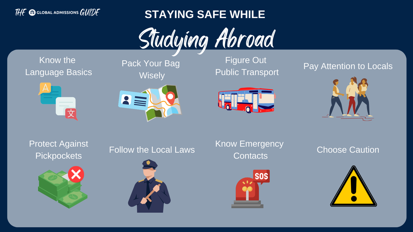 Undoubtedly, going to a different country to study presents some risks. New opportunities will bring new challenges. But, you can easily mitigate the risks and protect your personal safety no matter where in the world you are by following a few simple tips. Staying safe while studying abroad is a matter of basic preparation, observing your surroundings, and researching the local situation before you travel.