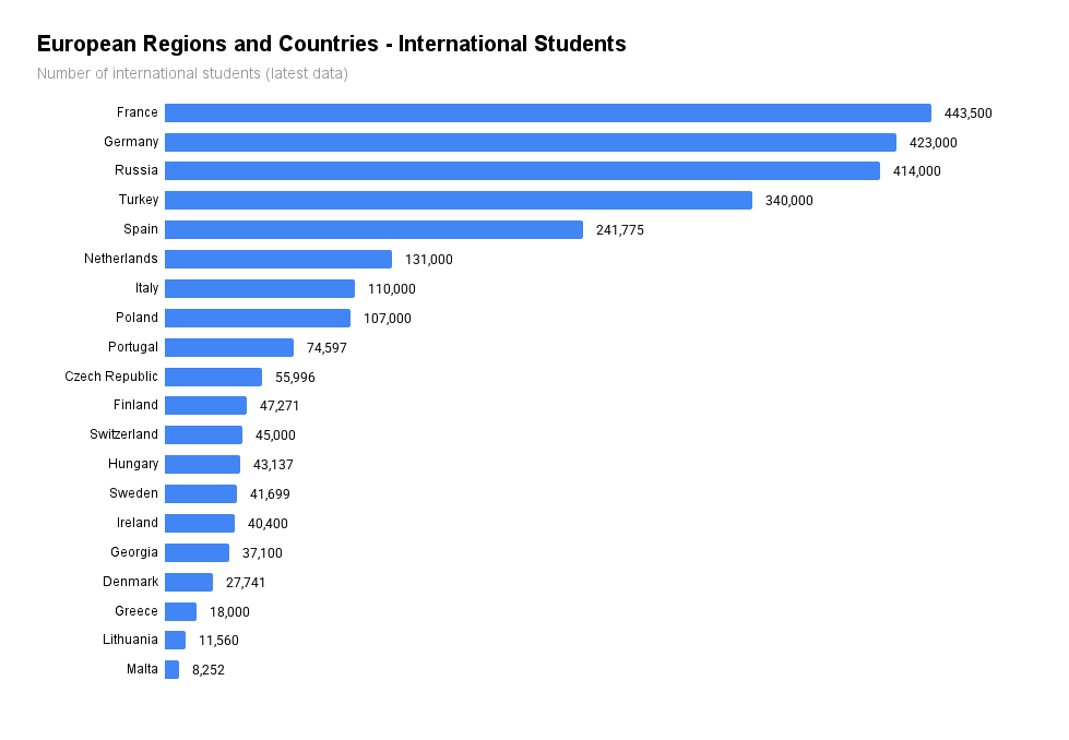 France reported 443,500 international students in 2025, and remains a top five global destination but is actively working to diversify its student base beyond Francophone Africa. The country offers quality education at public university rates significantly lower than Anglophone destinations.