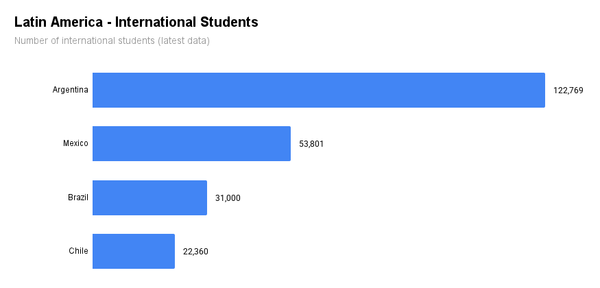 Argentina offers affordable education and renowned humanities programs, hosting 122,769 international students in its universities as of 2024. The capital, Buenos Aires, remains a primary global hub, attracting over 50,000 foreign learners annually, the majority of whom originate from neighboring South American countries like Brazil and Colombia.