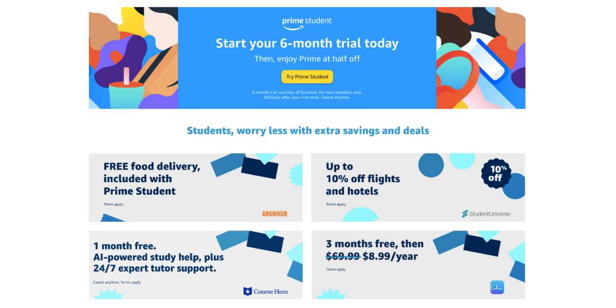 Amazon: Amazon offers a free six-month trial of Amazon Prime for students, which includes free two-day shipping, access to Prime Video, and other benefits. After the trial period, students can continue to enjoy Prime at a discounted rate. Learn more: amazon.com/student