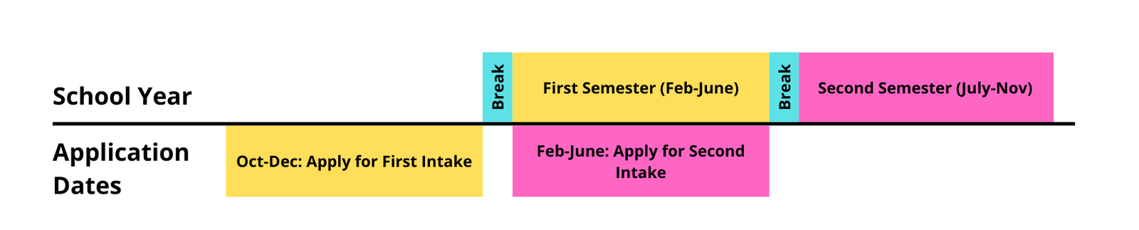 Application deadlines for February Intake (First Semester) are from October to December. The application deadlines for the July Intake (Second Semester) are February to June.