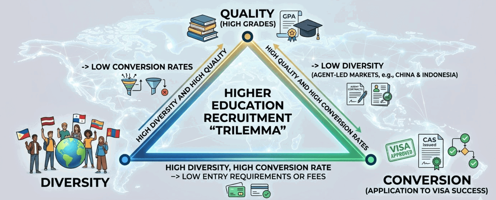 The traditional agent-led student recruitment market doesn't solve the impossible trilemma because of this. Top students in smaller markets like Latvia and Panama and Mongolia (who are the growign and underserved market), lose out, and so does the university.